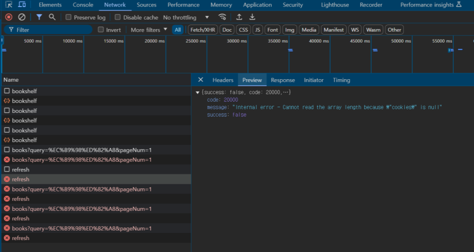 네트워크 탭에서 요청을 확인해보니, 요청 자체에 쿠키가 존재하지 않는데, 백엔드에서 쿠키를 읽으려고 하니 발생한 런타임 에러였다.