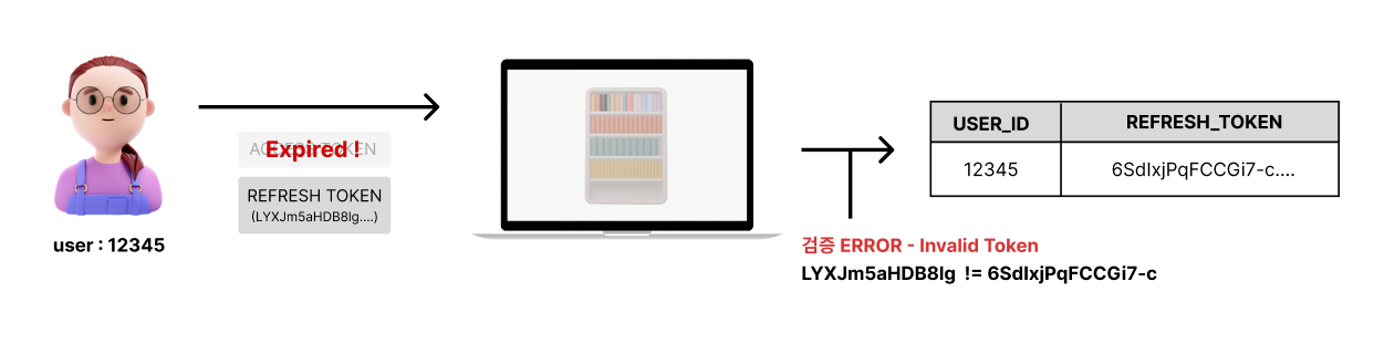그런데, 이 기기의 브라우저는 이미 DB에서 사라져버린 Refresh토큰 값을 갖고있다. 따라서 검증중에 에러가 발생하게 된다. 결국 Access토큰 재발급에 실패하고, 로그인을 다시해야하는것이다.