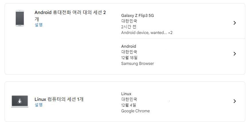 구글은 위와같이 개인정보 설정에서 로그인된 기기를 확인할 수 있다. 즉, 모든 로그인이 다른방식으로 저장되고 있다는 의미였다. 이를 기반으로 로직을 고민해본 결과, 기기에 따라 다른 고유값을 줌으로써 Refresh토큰 로직을 분리할 수 있으리라는 생각이 들었다.