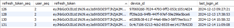 결과적으로 아래와 같은 DB가 완성된다. 같은 user임에도 불구하고 device_id 따로 저장하므로 refresh_token을 독립적으로 관리할 수 있게 되었다.